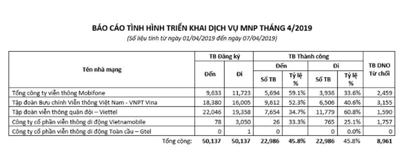 Từ ngày 1/4 đến 8/4/2019, dịch vụ chuyển mạng giữ số của Viettel đã quay trở lại tỷ lệ dương với lượng thuê bao đăng ký chuyển đến (22.046) lớn hơn chuyển đi (19.358). Trong khi đó, số lượng thuê bao đăng ký chuyển đến của VinaPhone là 18.380 và đi là 16.005.