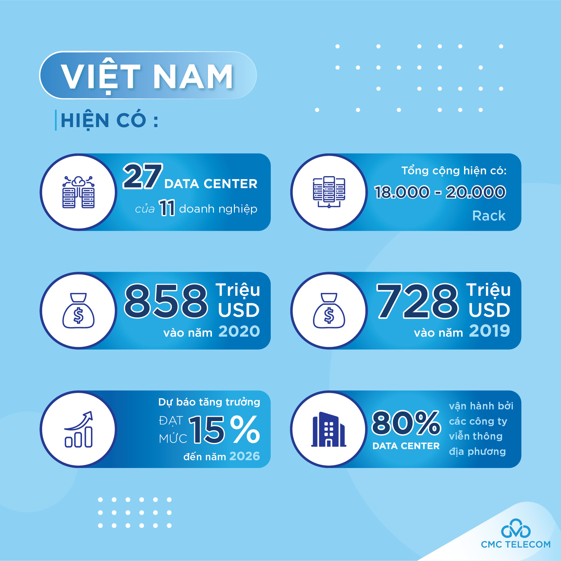 Theo Savills, quy mô thị trường trung tâm dữ liệu tại Việt Nam đạt 858 triệu USD vào năm 2020, trong khi năm 2019 đạt mức 728 triệu USD. Thị trường này cũng đồng thời được dự báo có tốc độ tăng trưởng đạt gần 15%/năm cho đến năm 2026.