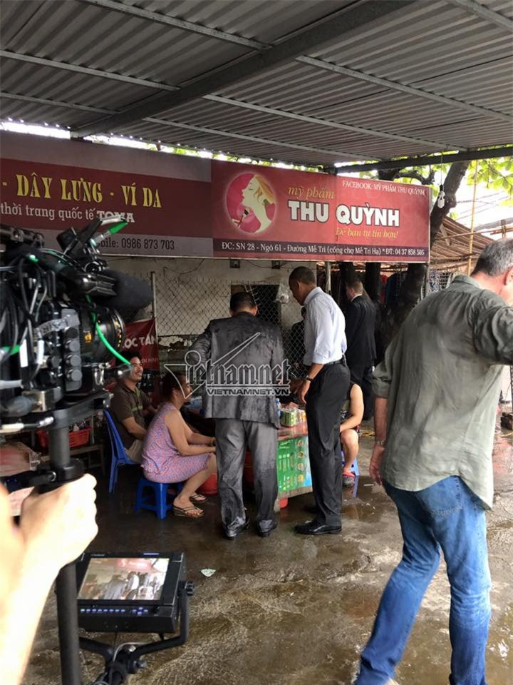 Chị Nguyễn Thu Trà, ở khu vực gần cổng chợ Mễ Trì Hạ, hiện là chủ quán trà đá cho hay, vào khoảng 13h15 thì Tổng thống Obama bất ngờ xuất hiện tại đây.