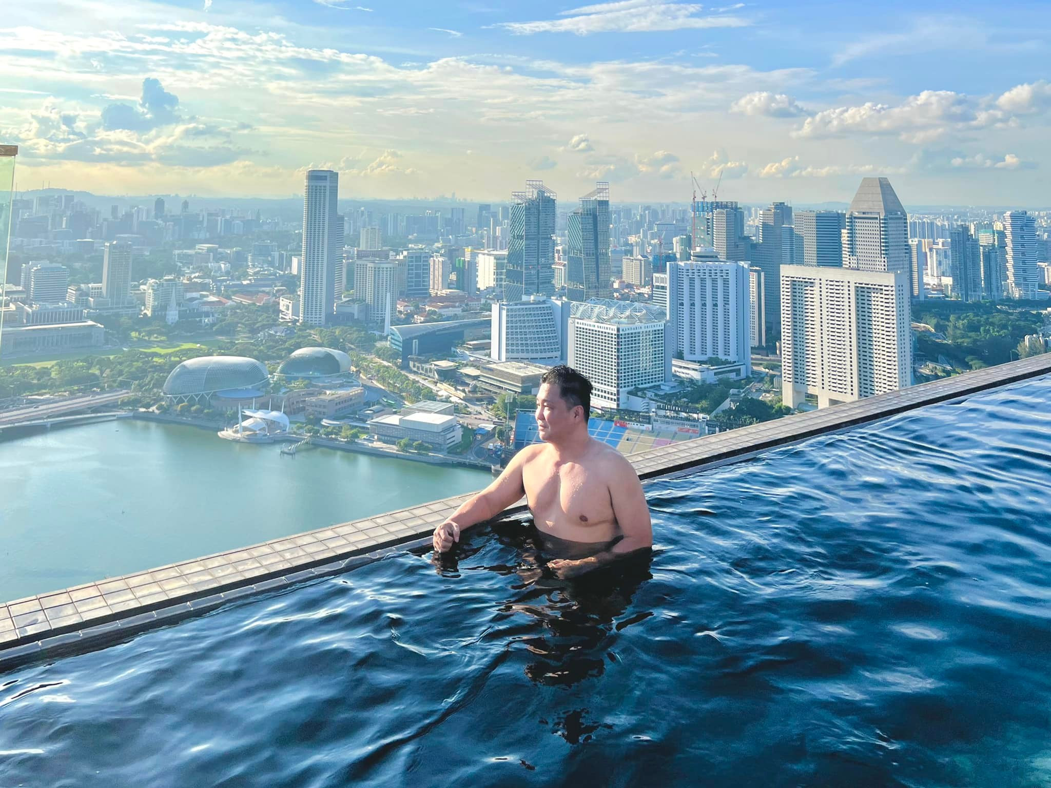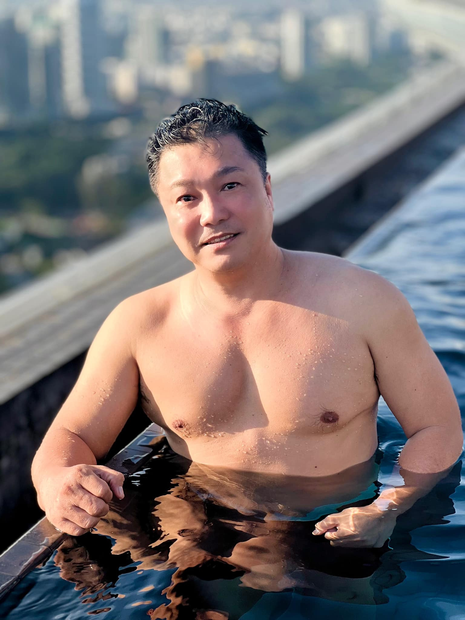 Lý Hùng chú thích loạt ảnh khoe hình thể ở bể bơi: "Buổi chiều vừa bơi vừa ngắm thành phố "đảo quốc sư tử" trong hồ bơi vô cực xinh đẹp". Bài viết nhanh chóng thu hút hàng nghìn lượt tương tác.