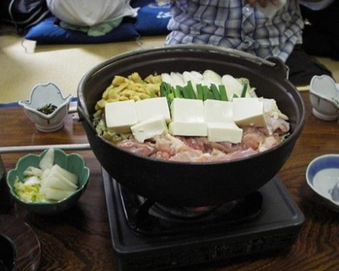 Món hầm, rau xanh và Chanko-nabe (gồm thịt gà, cá và đậu phụ) cung cấp