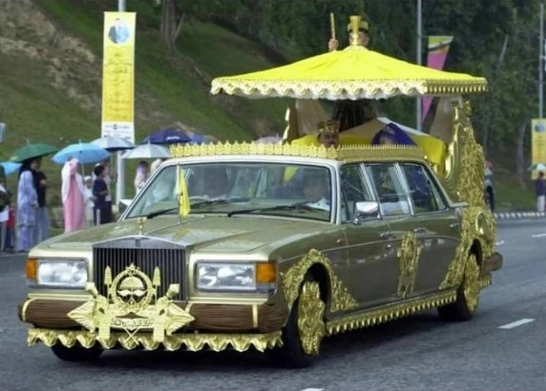 Quốc vương Hassanal từ lâu nổi danh là người sở hữu một trong những bộ sưu tập xe hơi hiếm nhất thế giới. Trong đó phải kể tới chiếc Rolls-Royce bọc vàng ấn tượng tới cả phần bánh xe. Chiếc xe siêu sang này được đặt làm riêng với mui trần, kệ để ô che mưa nắng và bọc vàng toàn bộ.