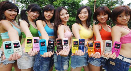 Những người mẫu Hàn Quốc trong trang phục đồng màu với các mẫu di động. Ảnh: Aving.net |