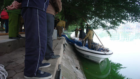 9h30, hai thợ lặn được mời từ Hải Phòng về đang lặn xuống hồ gỡ lưới bị mắc dưới đáy hồ. Hiện tại, lưới đang được thu hẹp dần.