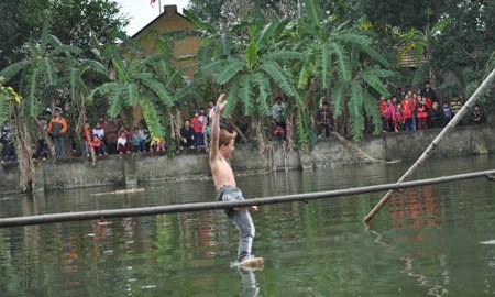 Luật chơi khá đơn giản: nếu ai đi thăng bằng trên cây tre này ra và bấu được vào sợi dây buông thõng sẽ thắng. Tuy nhiên do tre tươi, trơn và việc giữ thăng bằng không hề đơn giản đòi hỏi sự nhanh nhẹn, khéo léo.
