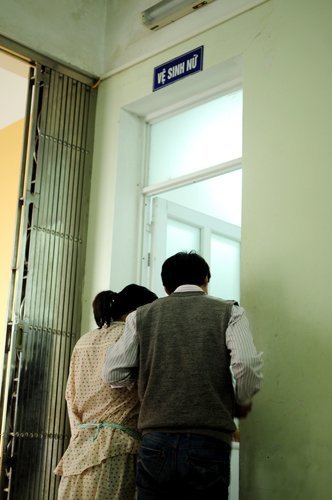 Không ngại đưa vợ vào tận phòng vệ sinh nữ. Ảnh: Bee.net.vn |