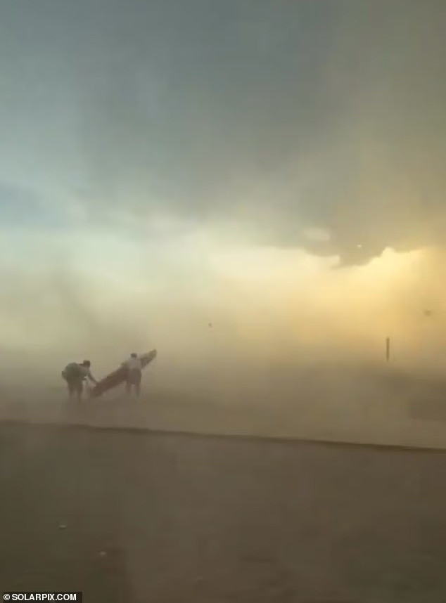 Hình ảnh nhân chứng ghi lại cho thấy bầu trời đột ngột tối sầm, bụi cát mù mịt, cây cối nghiêng ngả, trong khi du khách bỏ chạy tán loạn.