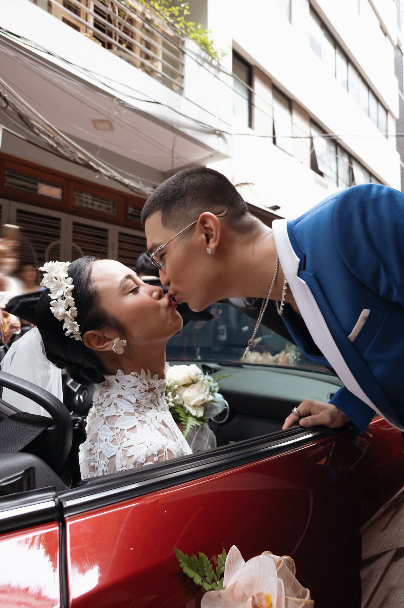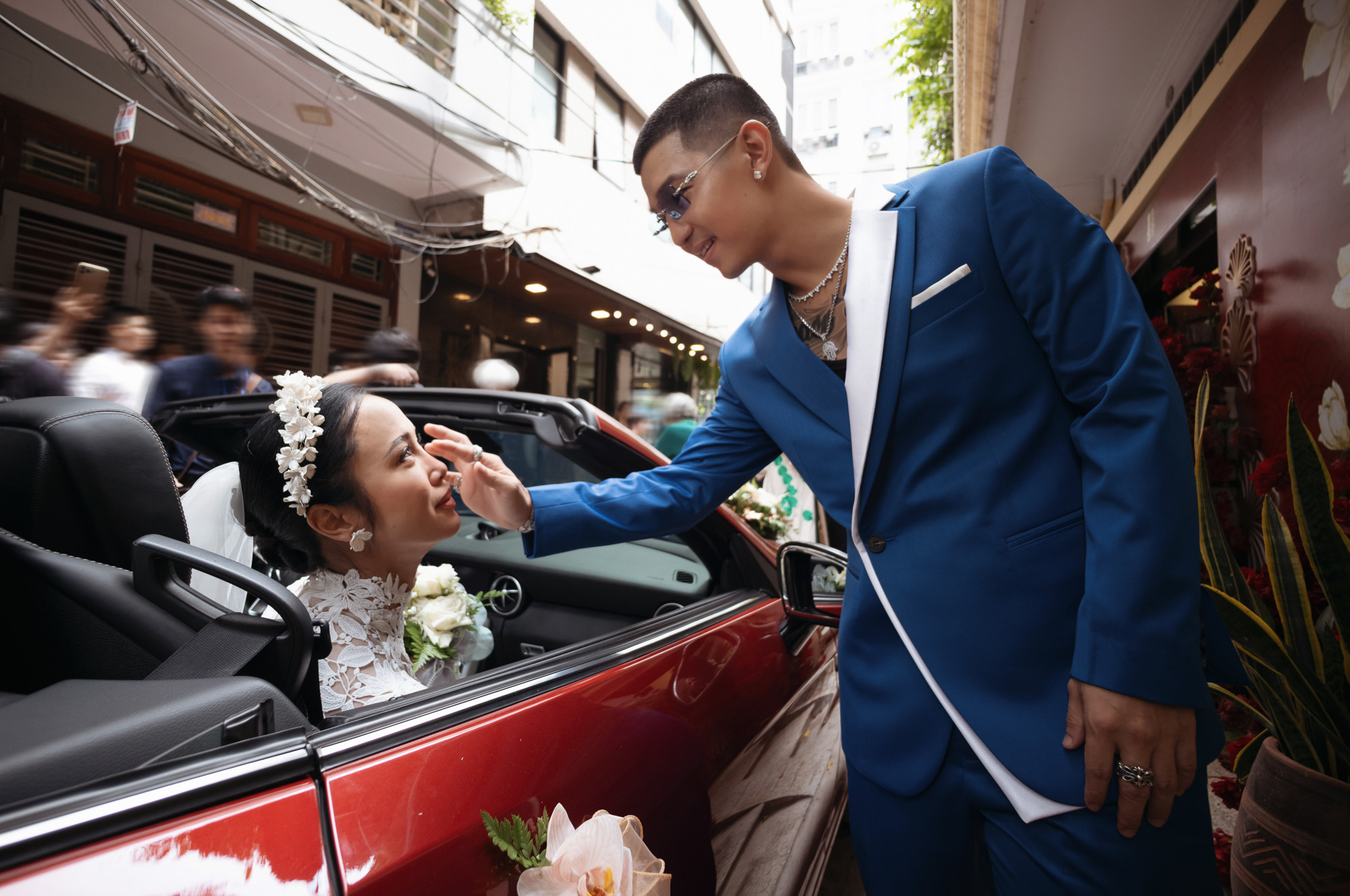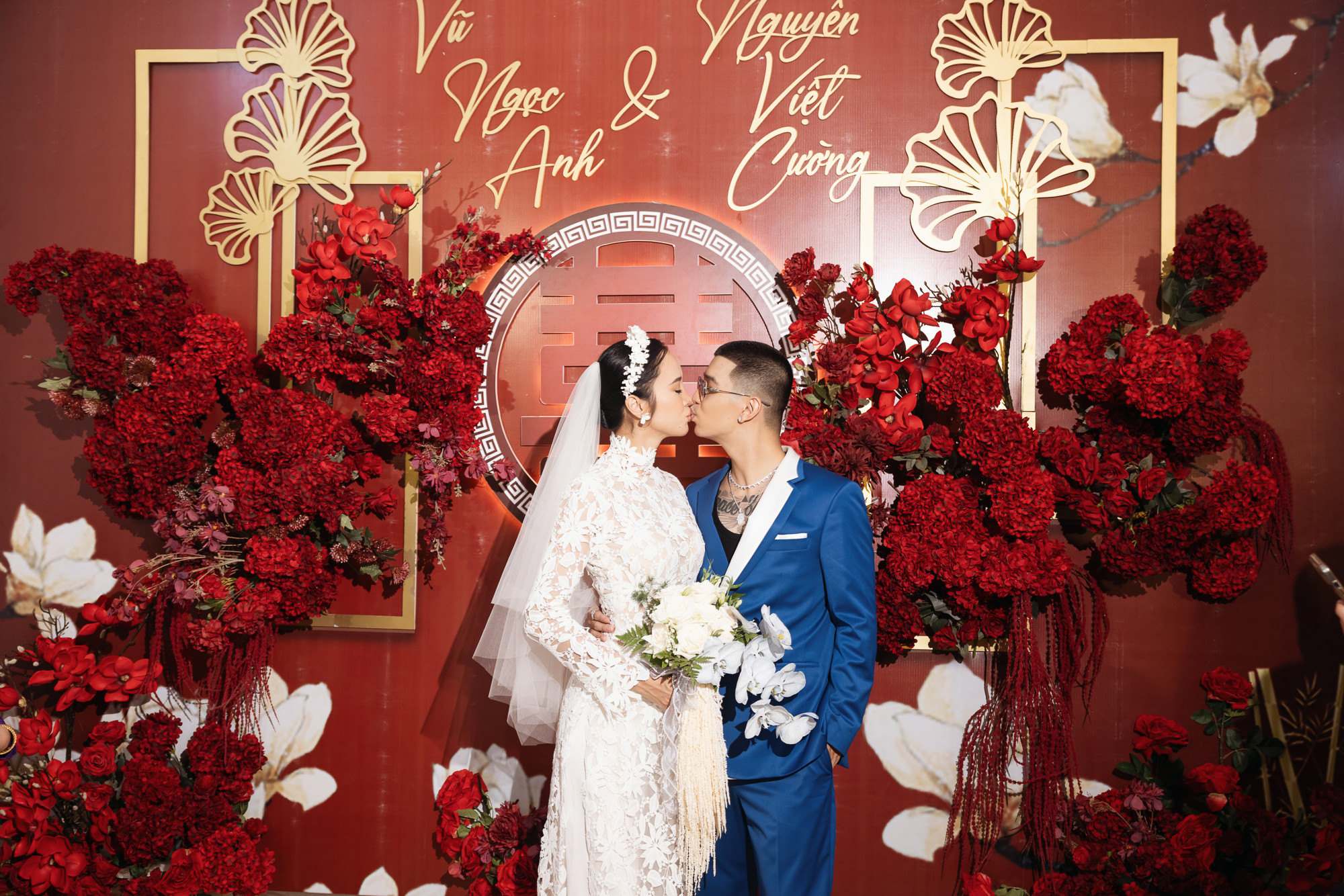 Chiều 28/7, Cường Seven lái xe mui trần tới nhà Vũ Ngọc Anh tại Hà Nội để đón dâu.Chú rể diện vest xanh bảnh bao, đeo kính, lái xế hộp màu đỏ vui vẻ chào mọi người.Chú rể điển trai vào phòng đón cô dâu ra ngoài ra mắt hai bên họ hàng. Gương mặt cô dâu, chú rể ngập tràn hạnh phúc trong ngày trọng đại. Vũ Ngọc Anh mặc áo dài trắng ren hoa, đầu đội khăn voan. Cô luôn nở nụ cười rạng ngời trước mọi người.Cả hai trao nhau nụ hôn ngọt ngào trước sự chứng kiến của người thân, bạn bè.