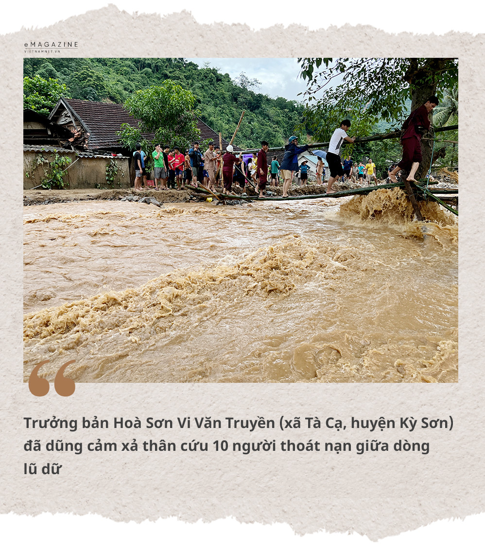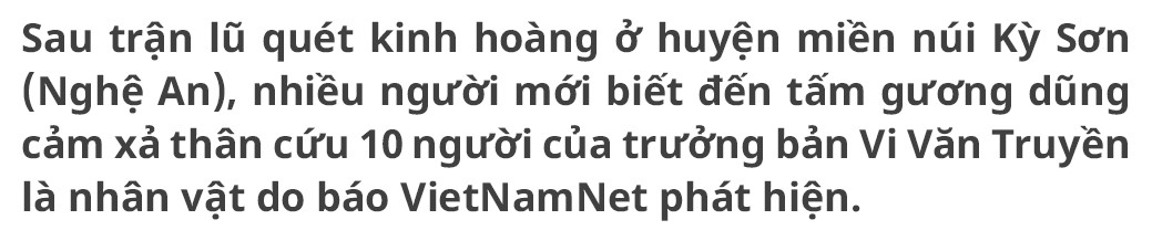 Gần 2 tháng sau khi trận “đại hồng thủy” qua đi, PV VietNamNet trở lại xã Tà Cạ (huyện Kỳ Sơn), gặp Trưởng bản Hòa Sơn Vi Văn Truyền (SN 1986) xả thân cứu người để có những ghi nhận, chia sẻ về nhân vật được Báo VietNamNet đề cử vào danh sách “Nhân vật truyền cảm hứng 2022”.