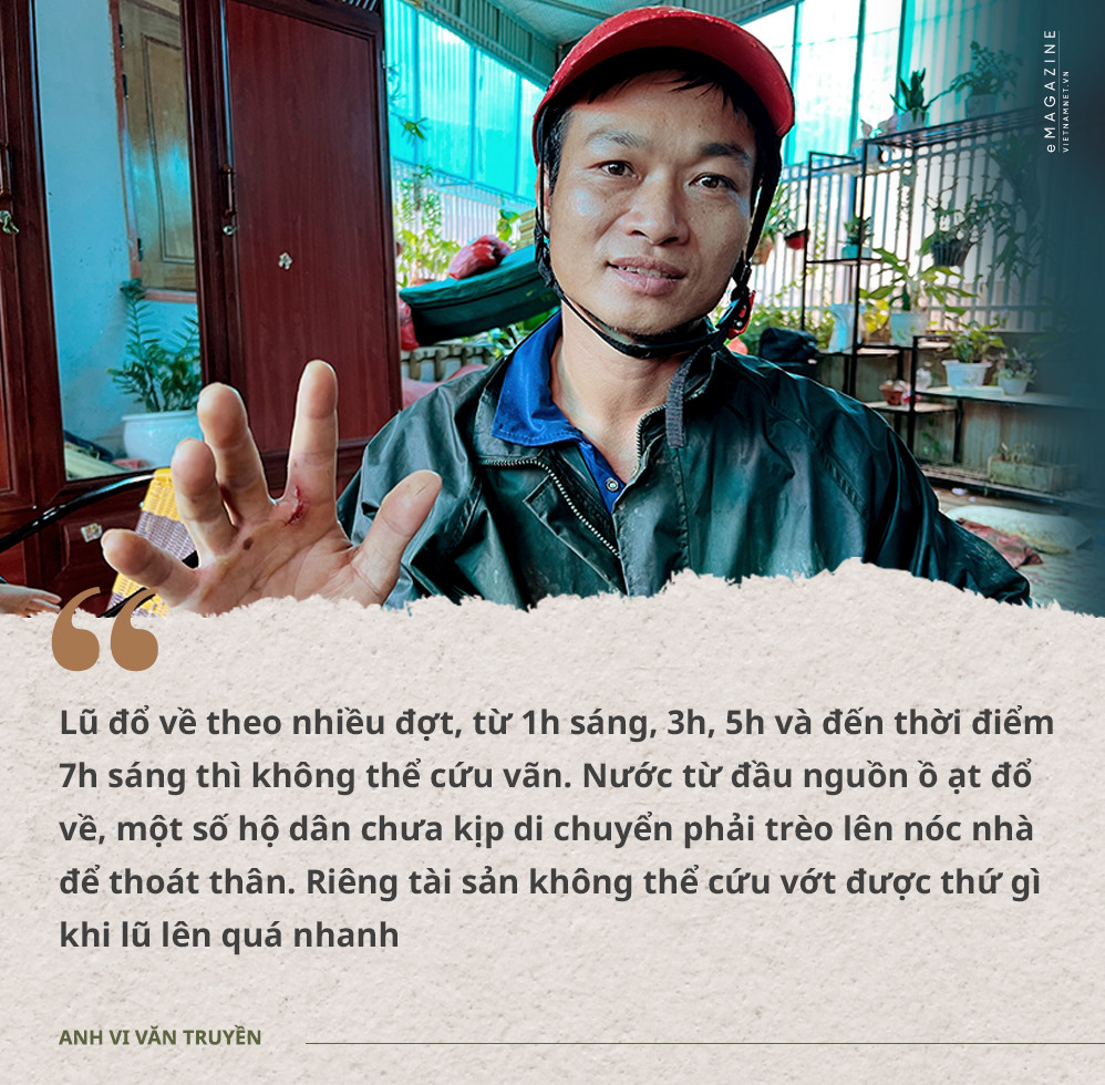 “Lũ đổ về theo nhiều đợt, từ 1h, 3h, 5h và đến thời điểm 7h thì không thể cứu vãn. Nước từ đầu nguồn ồ ạt cuồn cuộn về, một số hộ dân chưa kịp di chuyển phải trèo lên nóc nhà để thoát thân. Tài sản không thể cứu vớt được thứ gì khi lũ lên quá nhanh”, anh Truyền hồi tưởng.
