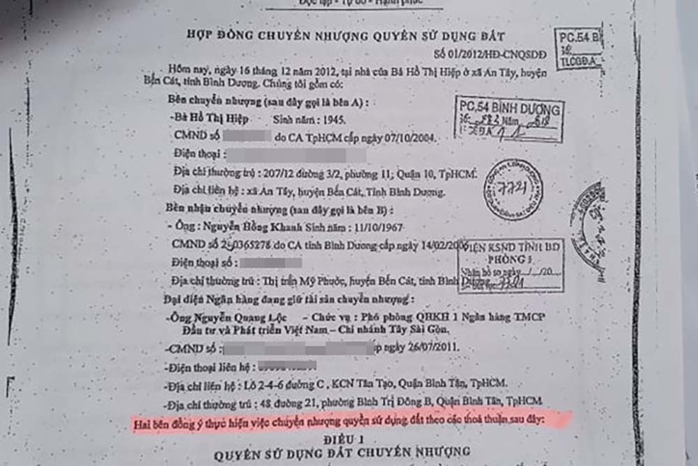 Nhân chứng là “cò đất” có khai, những lần dẫn ông Khanh đi xem đất, gặp bà Hiệp đều có mặt ông Hoà. Khi còn sống, bà Hiệp chưa từng khiếu nại, thậm chí bà đăng báo nhiều kỳ tìm kiếm khách mua, liên hệ ngân hàng làm thủ tục giải chấp, công chứng chuyển nhượng.