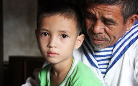 Cựu binh của đoàn tàu không số năm xưa buồn rầu bên đứa cháu khôi ngô nhưng chẳng may đã bị ảnh hưởng của chất độc da cam. Ảnh: Duy Tuấn