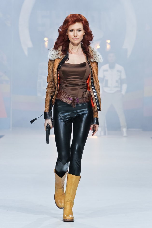 Nữ điệp viên với mái tóc đỏ xuất hiện vô cùng ấn tượng trên sàn catwalk với bộ đầm dài hở vai màu đỏ lộng lẫy như một nữ minh tinh. Màn trình diễn của cô trở nên hấp dẫn hơn nhiều với sự tháp tùng của hai nam người mẫu diện vest và đeo kính đen bí hiểm trong vai những siêu điệp viên.