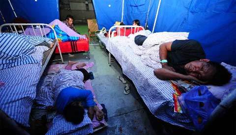Nạn nhân động đất nằm nghỉ trong lều bạt ở Vân Nam. (Ảnh: THX)