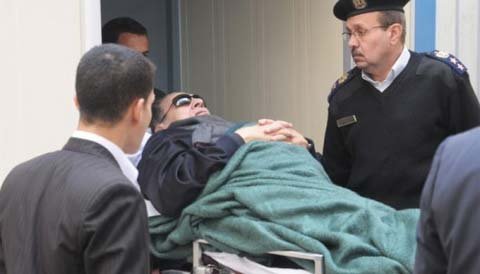 Cựu Tổng thống Ai Cập Hosni Mubarak được đưa trên xe lăn tới tòa án ở Cairo ngày 2/1/2012. (Ảnh: AP)