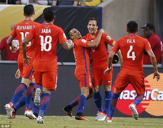 Chile: Bravo; Isla, Jara, Medel, Beausejour, Aranguiz, Silva, Hernandes (Pulgar 30'), Sanchez, Fuenzalida (Puch 74'), Vargas (Gonzalez 89')