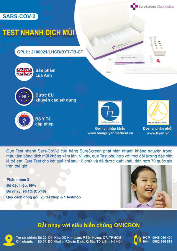 “Lúc đó tôi phát hiện ra có tiệm thuốc gần nhà đã giới thiệu cho tôi sản phẩm test dịch mũi nông SureScreen của Anh Quốc. Bạn dược sĩ nhấn mạnh kit test này sử dụng hiệu quả đối với trẻ em, lúc đầu tôi cũng không tin lắm, nhưng khi về test cho nhóc con mới 6 tháng thì khá nhạy”, anh V.M cho hay.