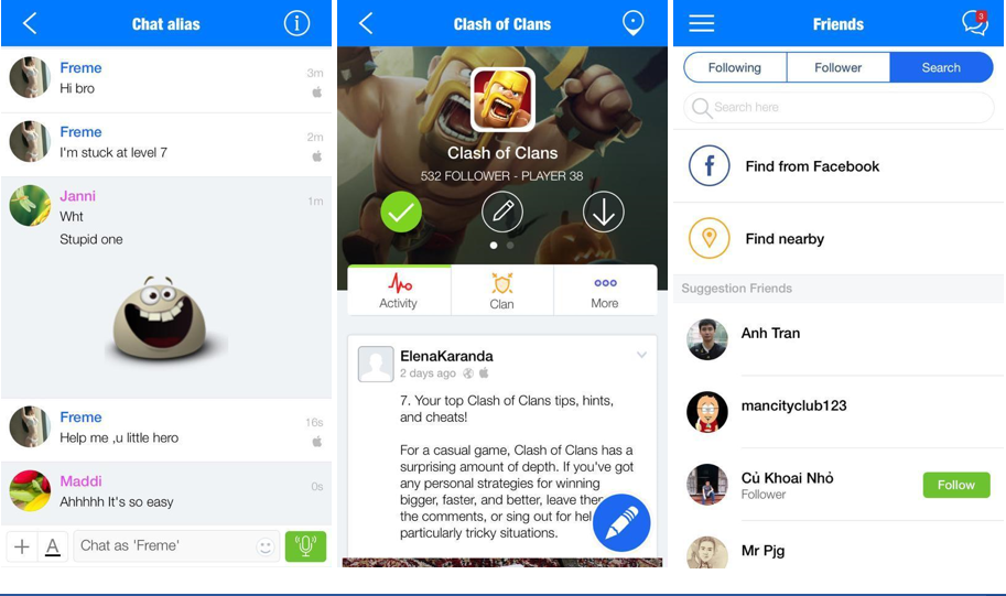 Trong số những mạng xã hội ngách của Việt Nam, onClan là ứng dụng khá nổi bật nhắm tới thị trường thế giới khi hướng tới kết nối tất cả game thủ mobile trên toàn cầu. Mô hình của onClan kết hợp Game Center và Facebook, nhưng mở rộng phạm vi giao tiếp bao gồm gợi ý tìm bạn, kết bạn, trò chuyện, chia sẻ kinh nghiệm giữa các game thủ và mở rộng không gian ra cả game offline. Thêm vào đó, ứng dụng này có vẻ như đang được đầu tư nhiều nhất và hoạt động ổn định nhất so với các ứng dụng ngách hiện có trên thị trường của Việt Nam. Về cơ bản, onClan cũng cung cấp những tính năng của mạng xã hội như gửi nhận tin nhắn, kết bạn, chia sẻ nội dung. Nhưng thêm vào đó, ứng dụng này cung cấp cho game thủ cơ hội chia sẻ kinh nghiệm chơi game, kết hợp bang nhóm trong game, và điểm đặc biệt là tính năng ẩn danh, chính xác là những gì game thủ mong muốn.
