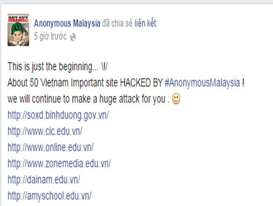 Như ICTnews đã đưa tin, sáng nay (10/12/2014), trên fanpage của nhóm hacker tự xưng Anonymous Malaysia đưa ra thông báo “khoảng 50 website quan trọng của Việt Nam đã bị #AnonymousMalaysia tấn công”. Cùng với việc đăng tải danh sách hơn 50 website của Việt Nam bị tấn công, nhóm hacker tự xưng Anonymous Malaysia còn đăng tải thông điệp “Đây mới chỉ là bắt đầu. Chúng tôi sẽ tiếp tục cuộc tấn công lớn này”.