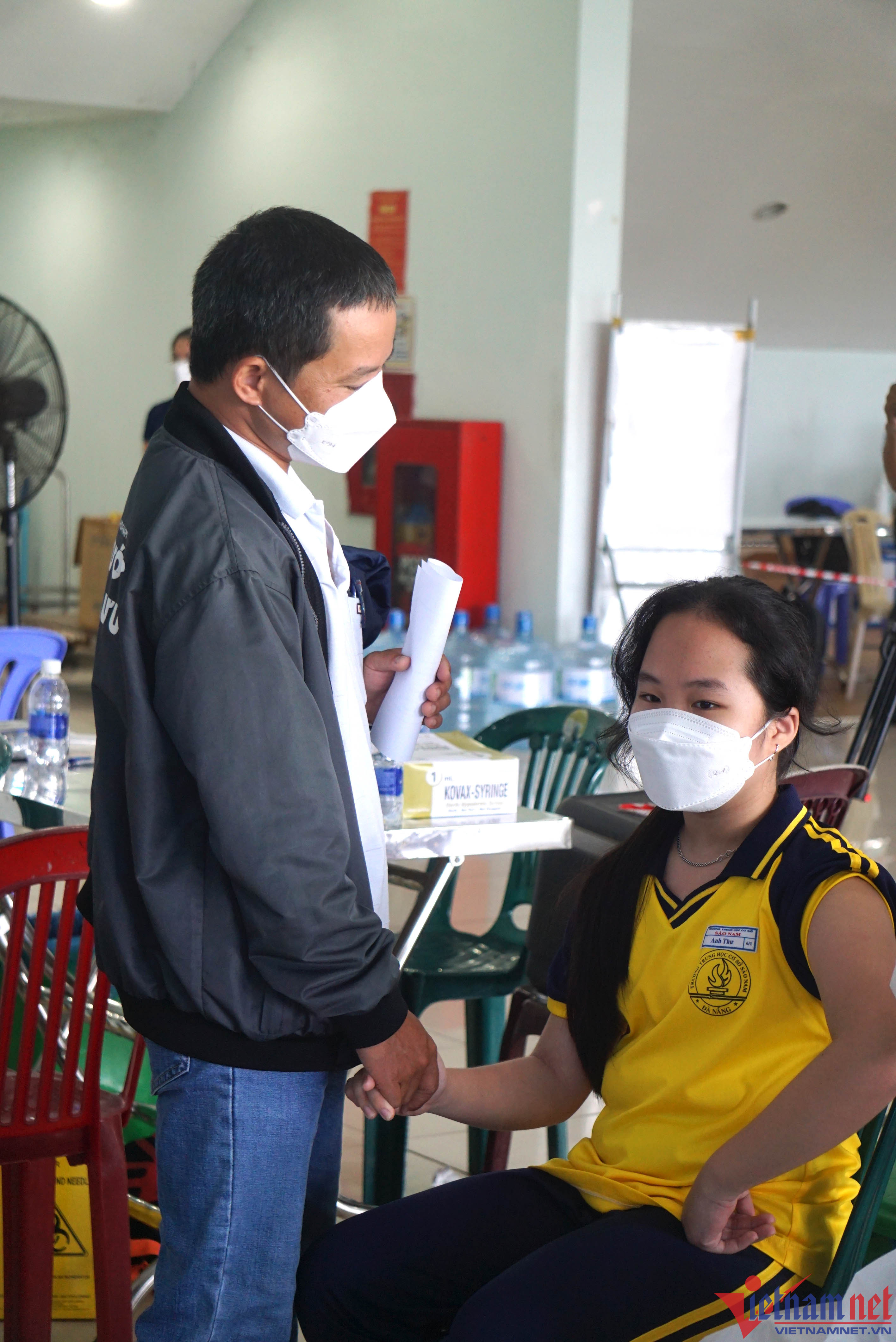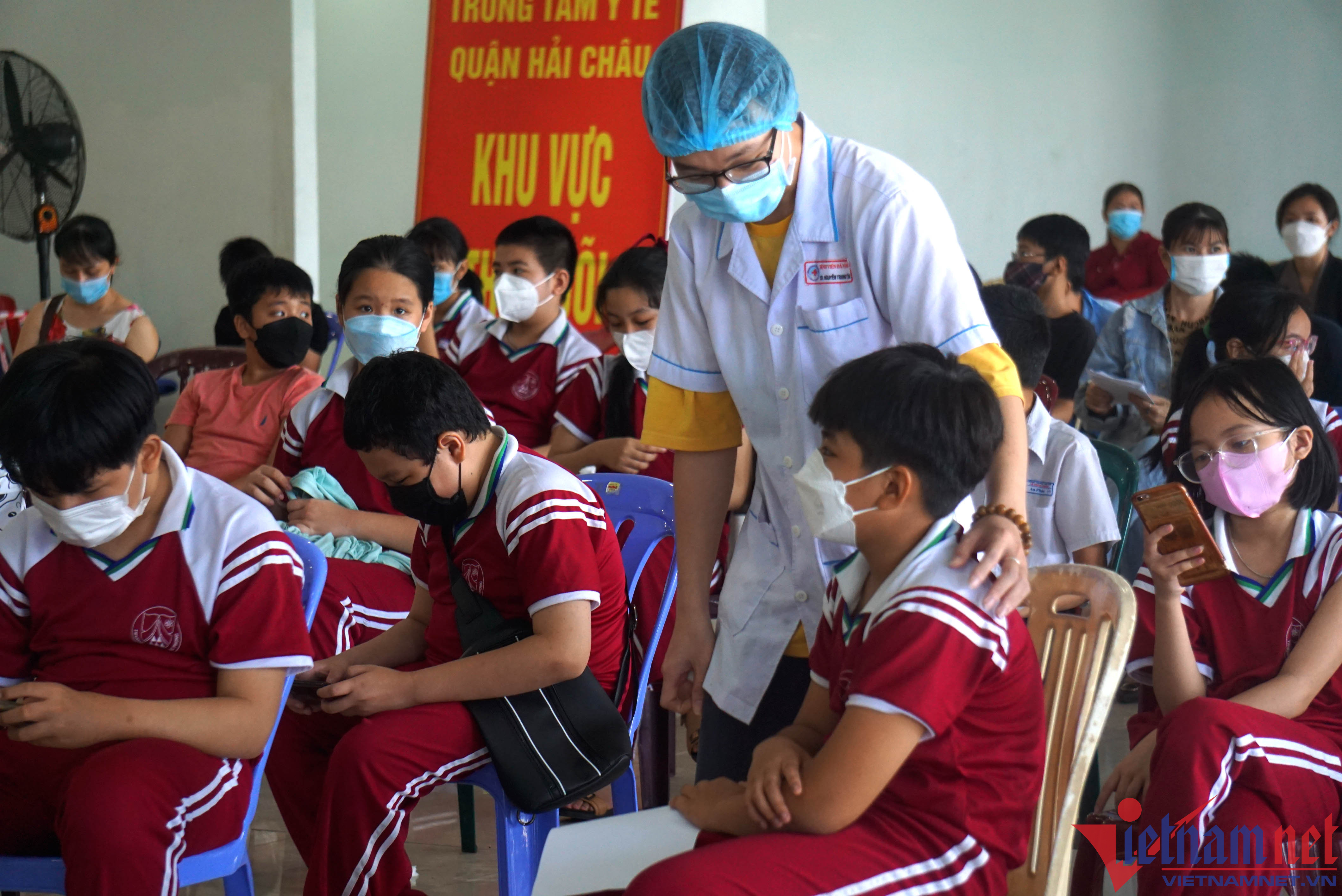 Ghi nhận của PV tại Cung thể thao Tiên Sơn (quận Hải Châu), ngành y tế bố trí 6 bàn tiêm, mỗi bàn có 8 cán bộ y tế chuẩn bị điều kiện và triển khai tiêm chủng đảm bảo an toàn. Trước khi tiêm, các em được khám sàng lọc.