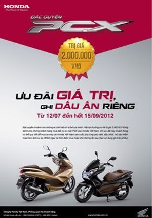 Từ 12/7-15/9/2012, khách hàng mua xe PCX sẽ được hưởng ngay “Đặc quyền PCX” với phiếu quà tặng trị giá 2 triệu đồng. Dự kiến sẽ có 5.400 phiếu quà tặng đến tay người tiêu dùng với tổng giá trị quà tặng lên tới gần 11 tỷ đồng.