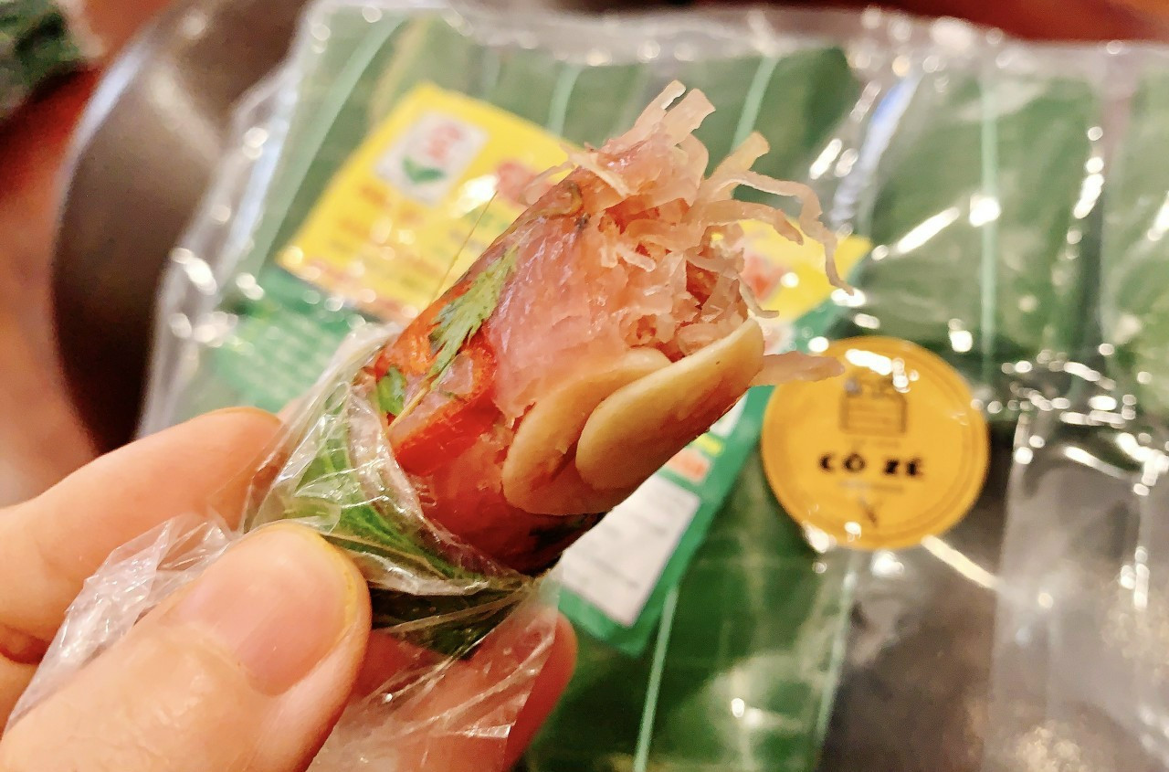 Sau khi pha chế xong nguyên liệu chính, bắt đầu công đoạn gói, từ nguyên liệu làm sẵn được vo thành từng chiếc, người gói cho thêm một vài lát ớt, tỏi và kèm theo một ít lá đinh lăng để tạo cho nem có một mùi thơm đặc trưng.
