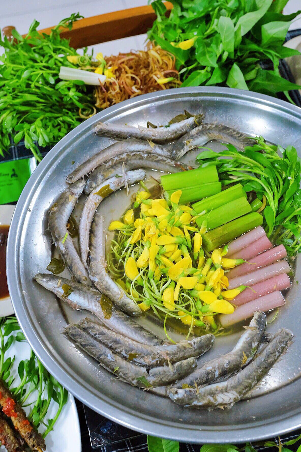 Ăn kèm với nồi nước lẩu là rất nhiều loại rau tự nhiên như rau nhút, rau đắng, điên điển, ngó súng, lục bình, húng quế...