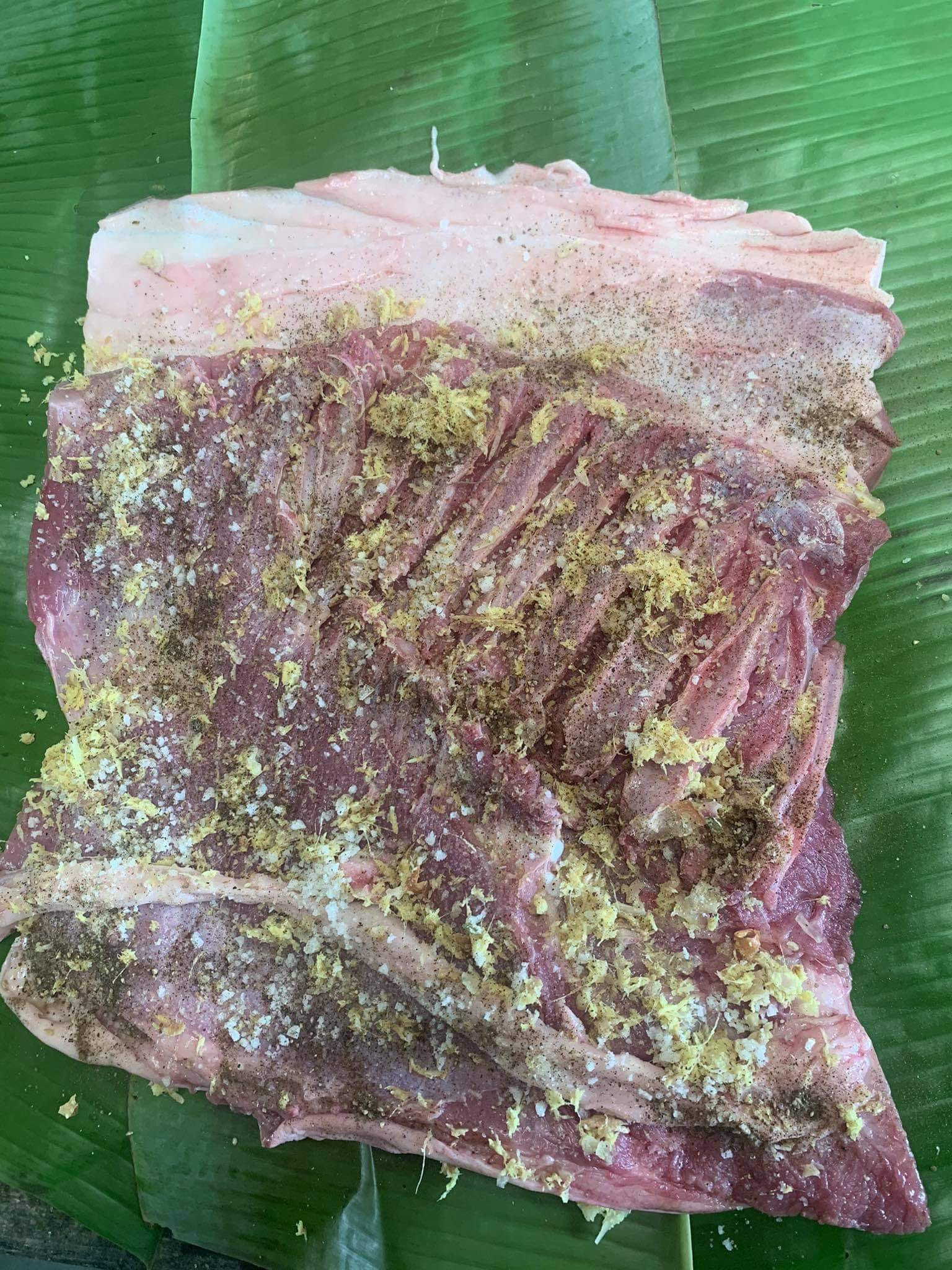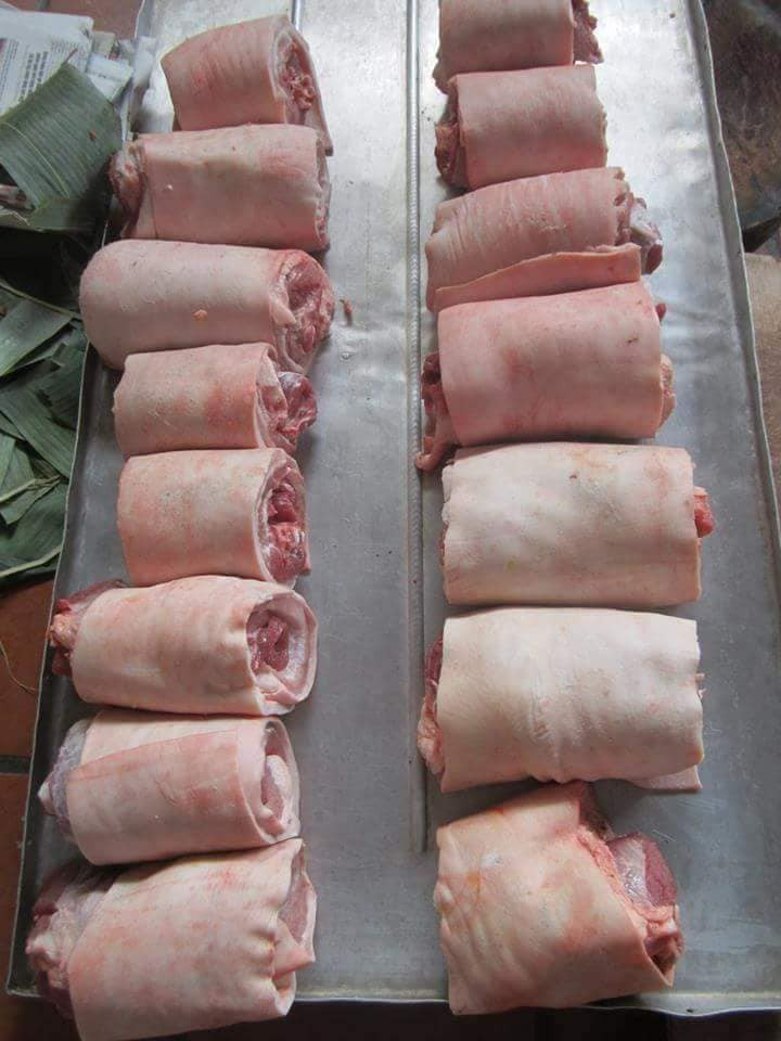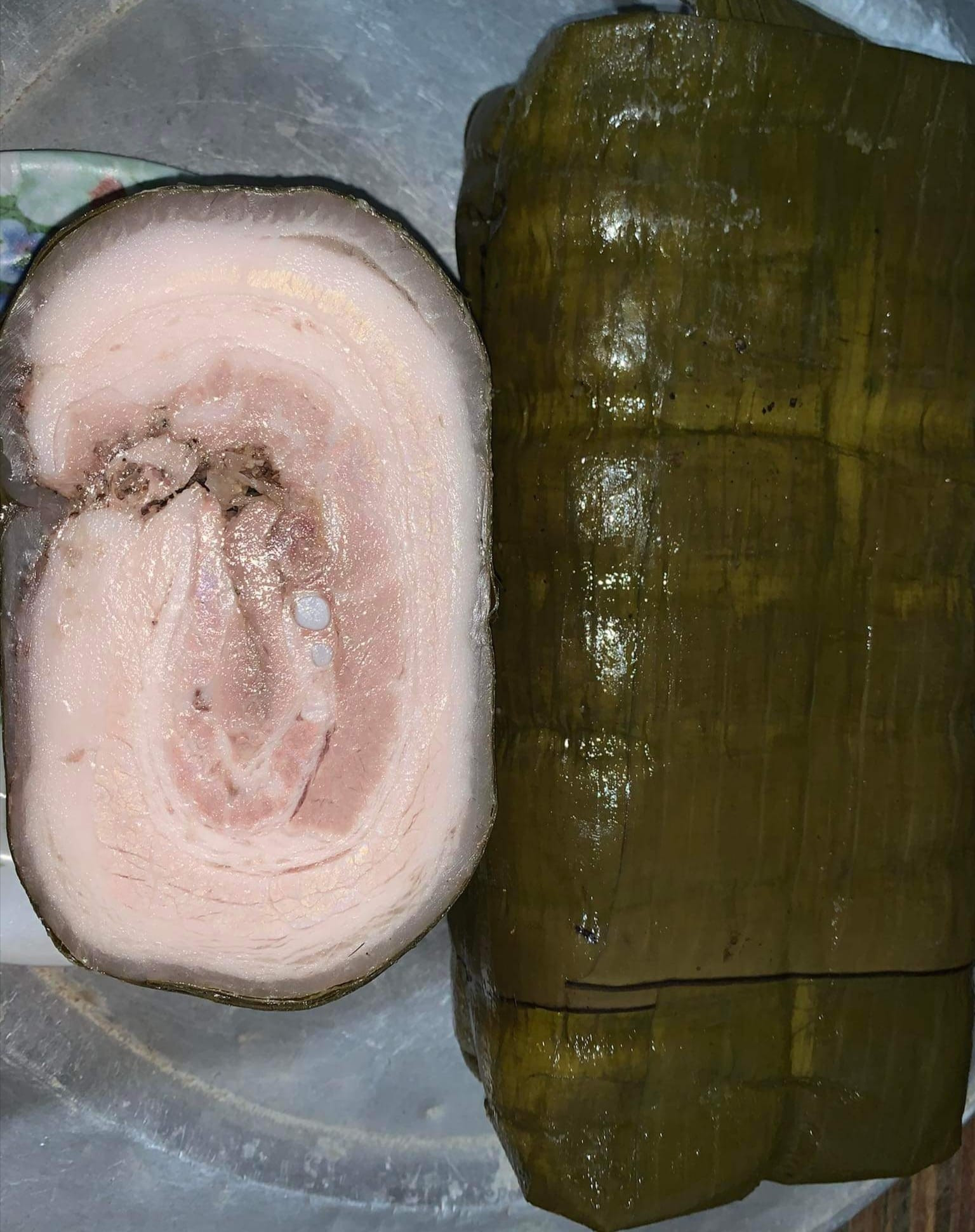 “Thịt ba chỉ được giữ nguyên lớp bì mỡ, xếp phần nạc lên trên chứ không pha trộn thêm loại thịt nào khác. Chờ khoảng 30-45 phút, khi thịt ngấm đều các gia vị thì đem bọc trong lá chuối, cuộn chặt lại và cố định bằng dây”, anh Nghĩa nói.