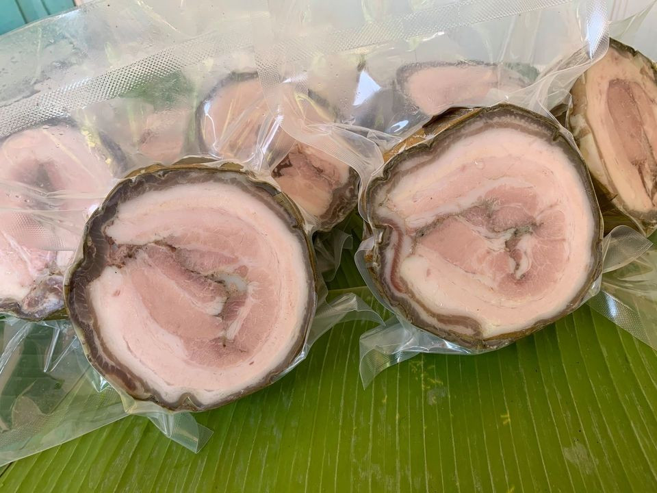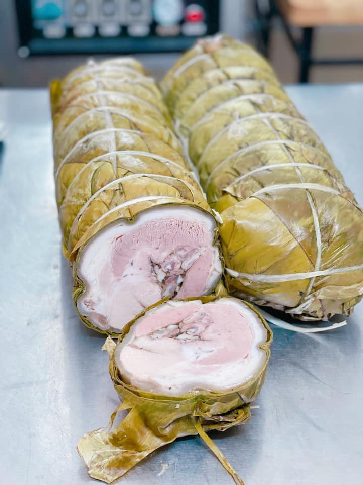 Giò nây có hương vị đậm đà, béo ngậy, mềm tan của thịt ba chỉ hòa quyện vị cay nồng của hạt tiêu, dậy mùi thơm lá chuối khiến thực khách ăn một lần nhớ mãi (Ảnh: Giò chả Oanh Lượng).