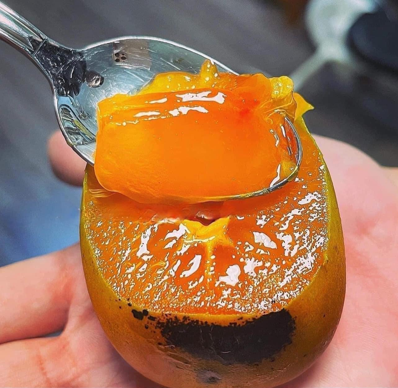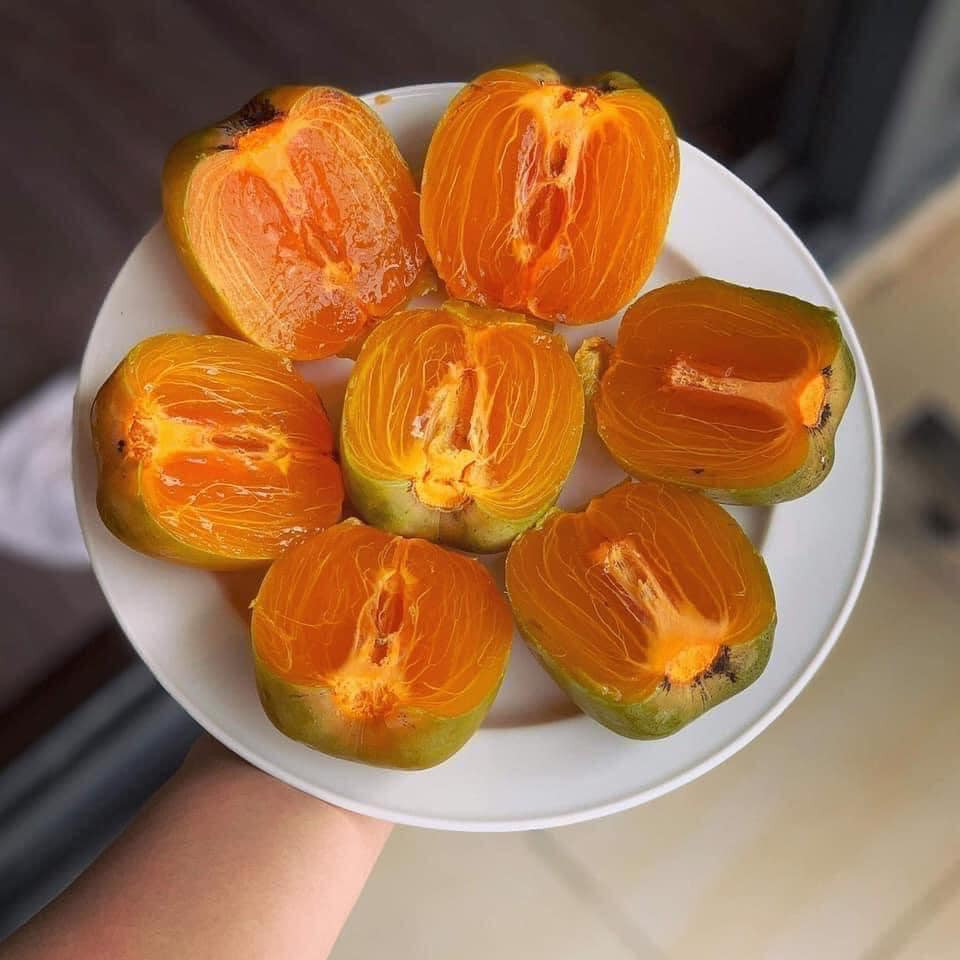 Khi chín, quả hồng da tre có phần thịt mọng, màu như trứng lòng đào, trong veo, ăn mềm nhưng không bị nhão. Loại hồng này nếu để lạnh trước khi ăn độ một giờ thì hương vị lại càng ngon hơn (Ảnh: Nhà hàng Bể cá)