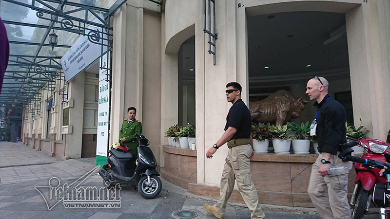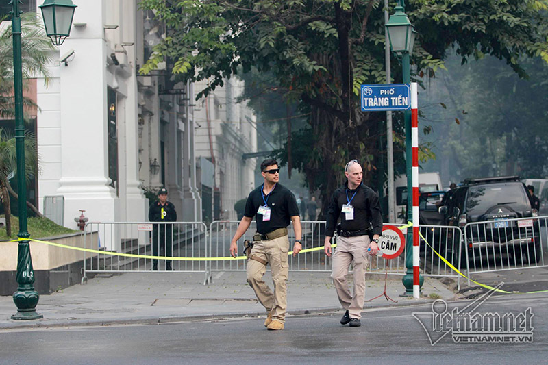 Ngay từ rất sớm, các tuyến đường Tràng Tiền, Lý Thái Tổ, Lê Phụng Hiểu... đều được lực lượng an ninh phong tỏa không cho người dân tiếp cận khu vực khách sạn (đoạn ngã tư Lý Thái Tổ, Lê Phụng Hiểu) .