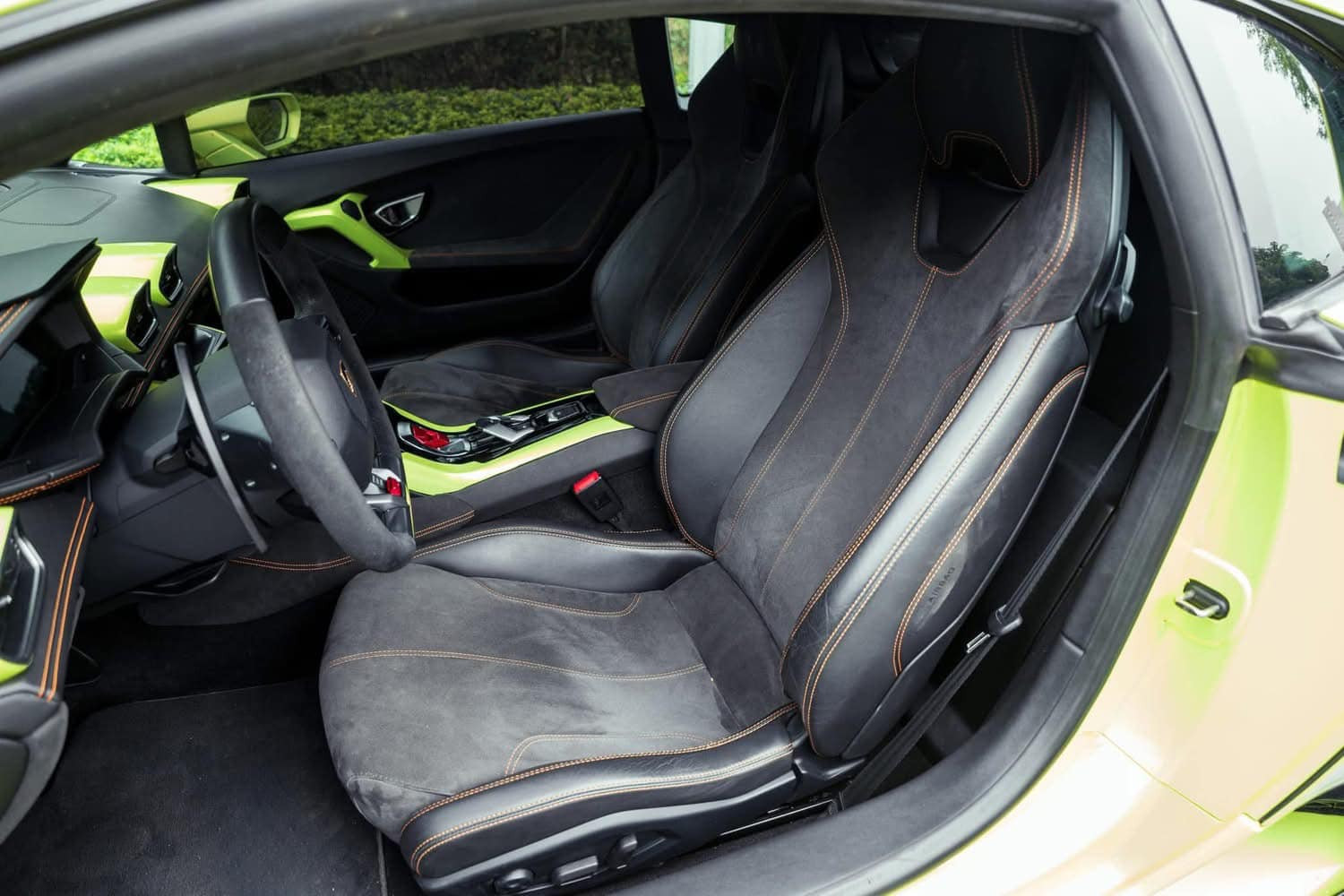 Chiếc Lamborghini Huracan LP610-4 này được trang bị bộ mâm kích thước 20 inch sơn màu đen bóng, thiết kế 5 chấu. Nổi bật bên trong là đĩa phanh gốm-carbon cỡ lớn và kẹp phanh màu cam, tạo nên phong cách “tông xuyệt tông” cho tổng thể xe.