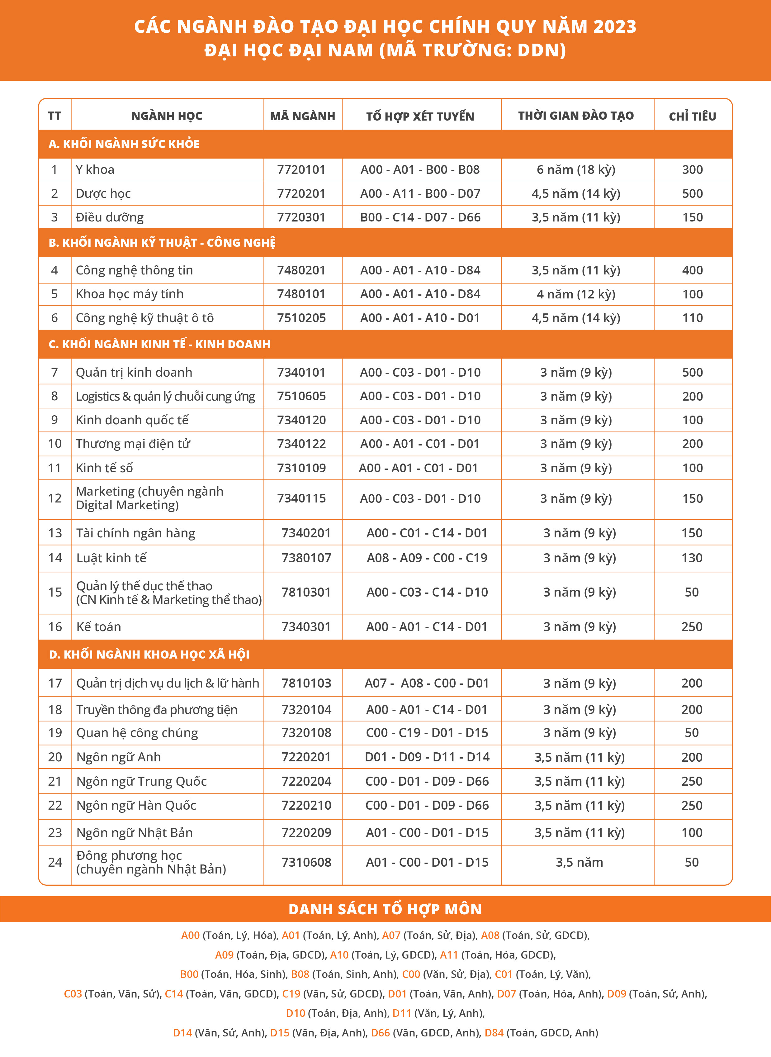 4 phương thức xét tuyển vào trường Đại học Đại Nam năm 2023 Năm học 2023 - 2024, Đại học Đại Nam tuyển sinh hệ đại học chính quy ở 24 ngành đào tạo theo 4 phương thức xét tuyển: - Sử dụng kết quả 3 môn từ kết quả kỳ thi tốt nghiệp THPT theo tổ hợp đăng ký để xét tuyển. - Sử dụng kết quả 3 môn từ kết quả học tập lớp 12 THPT theo tổ hợp đăng ký để xét tuyển. - Xét tuyển thẳng theo quy định của Bộ Giáo dục và Đào tạo và Nhà trường. - Xét tuyển thí sinh tốt nghiệp THPT nước ngoài. Đăng ký xét tuyển: https://xettuyen.dainam.edu.vn/ Hotline/Zalo: 0931 595 599; 0961 595 599 ; 0971 595 599 |