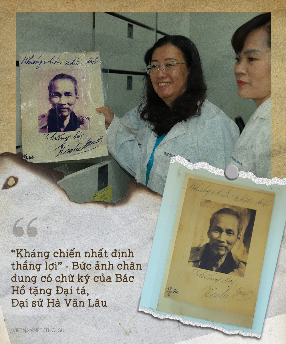 Về những tài liệu được trao tặng cho Cục Văn thư và Lưu trữ, trong đó có cả những hình ảnh quý giá được giữ đến nay như bức chân dung Bác Hồ tặng ông Hà Văn Lâu. Dưới bức chân dung này có câu: “Kháng chiến nhất định thắng lợi”.