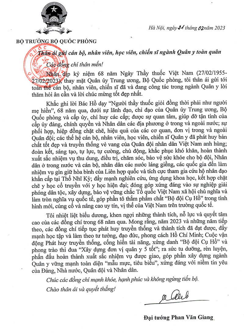 Nhân dịp kỷ niệm 68 năm Ngày Thầy thuốc Việt Nam (27/02/1955 - 27/02/2023), thay mặt Quân ủy Trung ương, Bộ Quốc phòng, tôi thân ái gửi tới toàn thể cán bộ, nhân viên, chiến sĩ đã và đang công tác trong ngành Quân y lời thăm hỏi ân cần và lời chúc mừng tốt đẹp nhất.