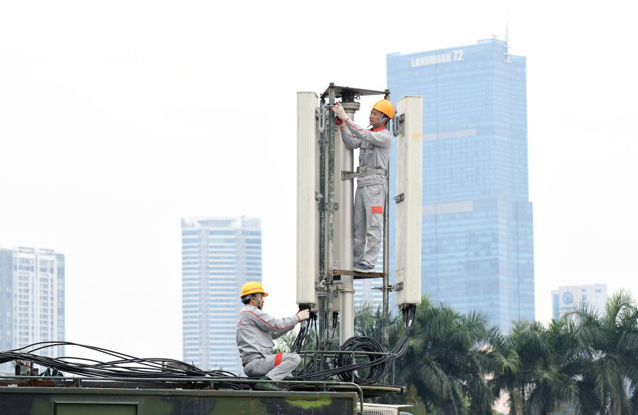 | Kỹ sư Tập đoàn Công nghiệp - Viễn thông quân đội bảo dưỡng trạm băng tần S, bảo đảm cung cấp dịch vụ 4G, 5G phục vụ khách hàng. Ảnh: hanoimoi.vn |