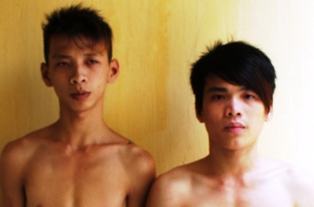 Huỳnh Tấn Thiện (trái) và Phạm Văn Định (phải) tại cơ quan công an |
