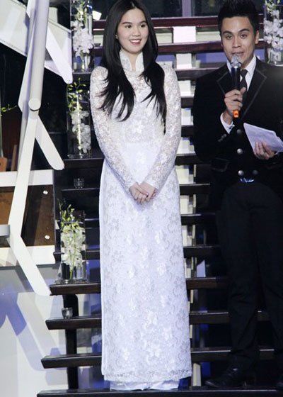 | Ngọc Trinh trong bộ áo dài được trả giá 40 triệu đồng tại buổi đấu giá từ thiện “Tri ân người mẹ” (Ảnh: VietNamNet) |
