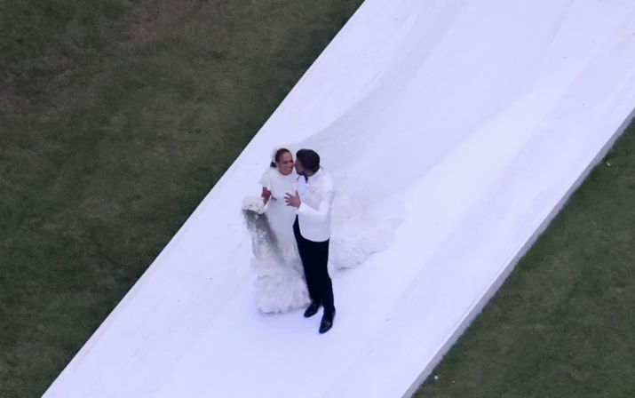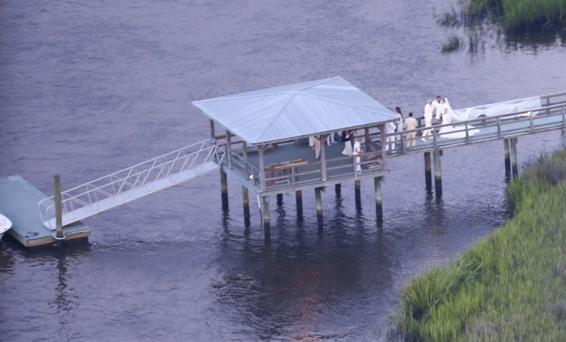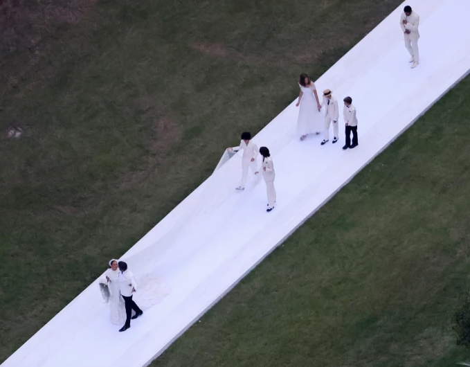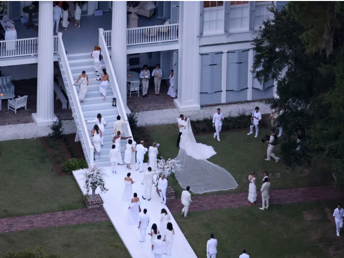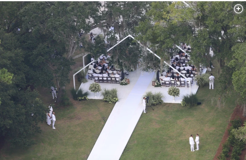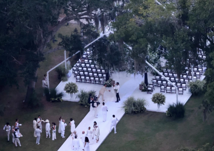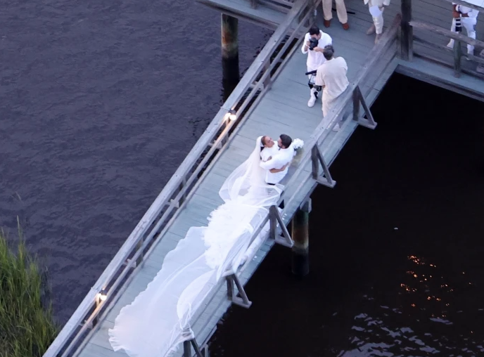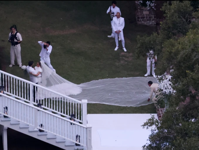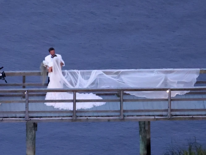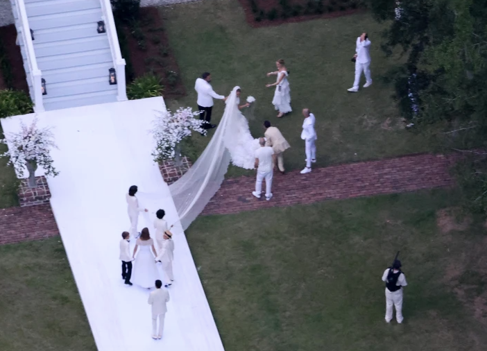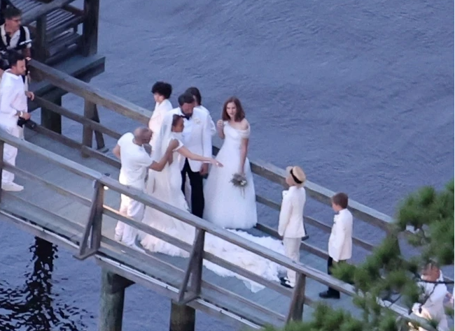 Jennifer Lopez và Ben Affleck trao nhau nụ hôn trong lễ cưới diễn ra tại dinh thự của chú rể ở Riceboro, Mỹ ngày 20/8. Jennifer Lopez nở nụ cười hạnh phúc bên Ben Affleck. Cô dâu mặc váy cưới Ralph Lauren đuôi dài 7 mét. 5 người con của cô dâu chú rể với đời chồng/vợ trước cũng tham dự lễ cưới để chúc phúc cho bố mẹ. Ben Affleck và Jennifer Lopez ôm nhau chụp ảnh trên chiếc cầu nhỏ trong dinh thự. Toàn bộ khách mời cũng như thợ ảnh cũng đều mặc màu trắng. Cặp đôi trao nhau nụ hôn trước mặt quan khách. Khoảnh khắc hạnh phúc của Jennifer Lopez và Ben Affleck trong siêu đám cưới kéo dài 3 ngày. Trước đó họ tổ chức lễ cưới nhỏ trong phạm vi gia đình hồi tháng 7 vừa qua. Không gian tiệc cưới ngoài trời với tông màu trắng chủ đạo. Đáng lẽ đám cưới của họ đã diễn ra từ 18 năm trước nhưng vì nhiều lý do cặp đôi đã huỷ hôn vào phút chót. Các con của nữ diễn viên 'Marry Me' giúp nâng đuôi váy cho mẹ khi bước đi cùng chồng mới cưới vào lễ đường. Ben Affleck kém Jennifer Lopez 2 tuổi. Cặp đôi mới tái hợp năm ngoái và quyết định đi đến hôn nhân ở tuổi 50. Cô dâu chú rể cùng khách mời đứng trên đoạn cầu thuộc dinh thự trị giá 8 triệu USD của Ben Affleck ở Georgia. Toàn bộ truyền thông không được tác nghiệp trong lễ cưới bởi tờ VOGUE (MỸ) được độc quyền phần ảnh cưới của cặp sao.Ảnh chụp địa điểm diễn ra đám cưới ở trên cao.Dự lễ cưới của Ben Affleck và Jennifer Lopez có rất nhiều ngôi sao góp mặt.