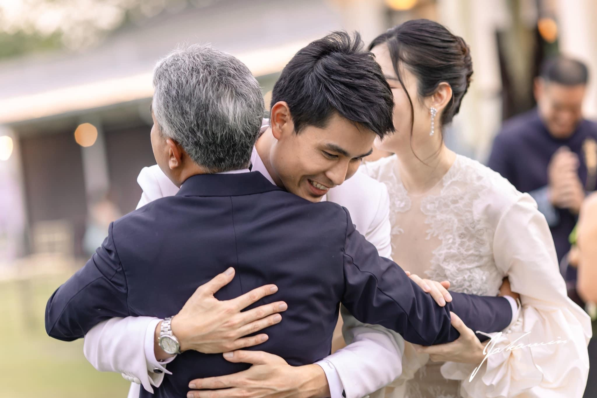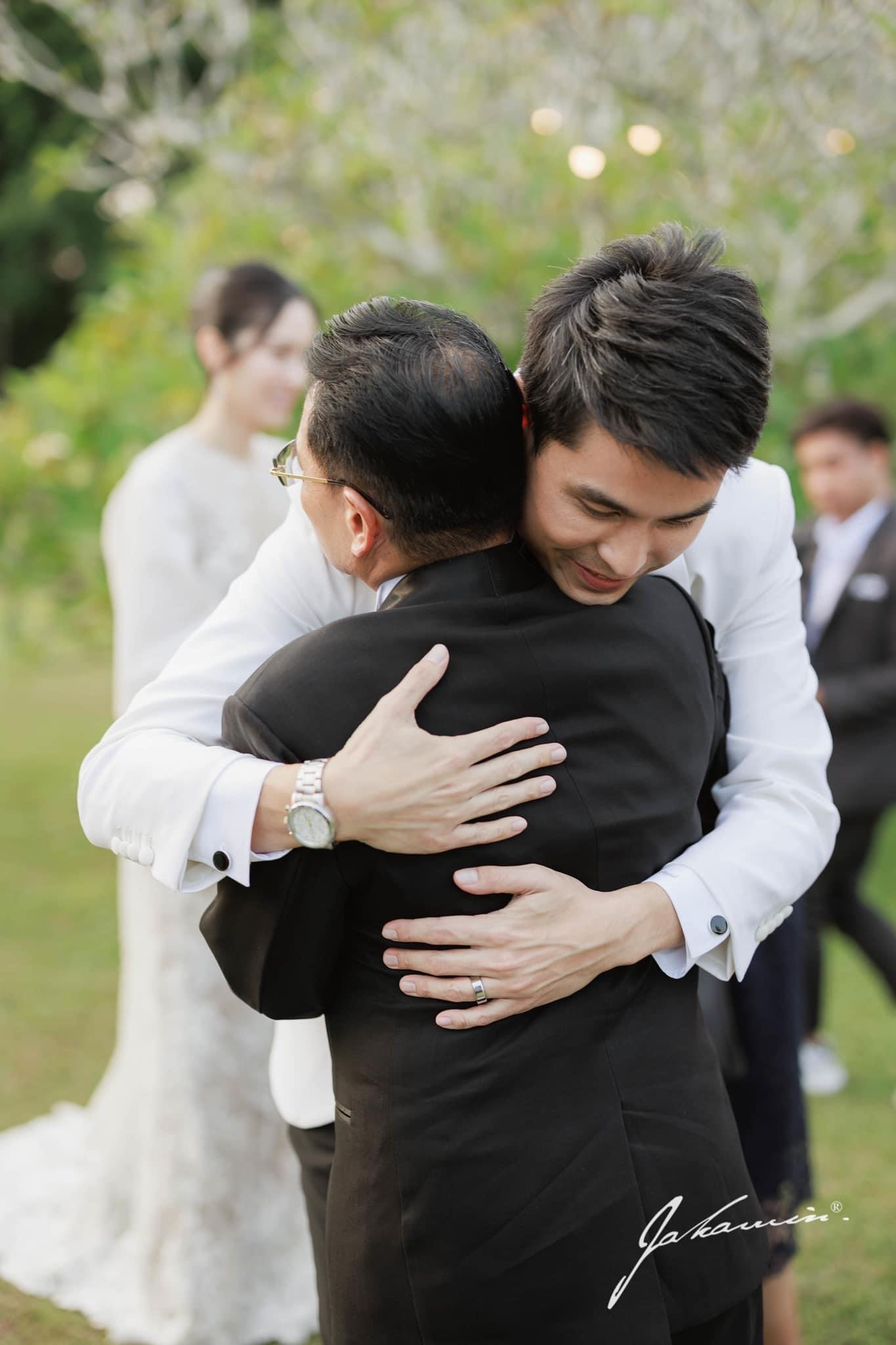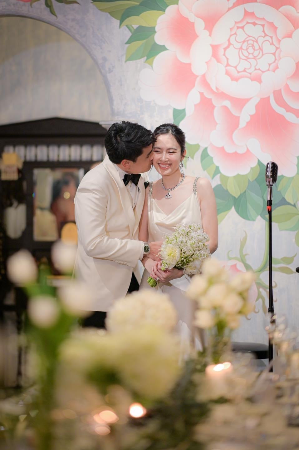 Không gian tiệc cưới được trang trí đơn giản theo sở thích của cô dâu, chú rể và sử dụng tông xanh - trắng chủ đạo.Oak Phakwa Hongyok hơn Nong Poy 4 tuổi. Hai người quen biết nhau hơn 20 năm, trước khi Nong Poy phẫu thuật chuyển giới. Cả hai trải qua một vài mối tình trước khi nảy sinh tình yêu. Nong Poy cảm thấy cô và ông xã hiểu nhau, có thể san sẻ khi gặp khó khăn.Nong Poy cùng vị hôn phu tay trong tay, trao nhau cử chỉ tình tứ tại hôn lễ. Chuyện tình cảm của Nong Poy và chồng doanh nhân khiến nhiều người ngưỡng mộ. Cặp đôi quen nhau từ thời trung học, Oak là bạn của anh trai Nong Poy. Khi đó trong mắt anh, Nong Poy hiền lành, nhút nhát, hay bị bạn bè trêu chọc.