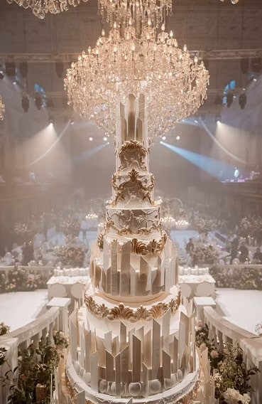 Ngoài khu vườn thơ mộng, hội trường còn trang trí bằng một tác phẩm điêu khắc băng, khắc tên viết tắt của cặp đôi, chiếc đèn chùm khổng lồ và chiếc bánh cưới cao 1,8m.