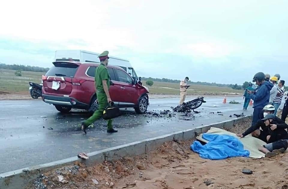 Đến đoạn xã Bình Minh (huyện Thăng Bình), bất ngờ xe máy đâm trực diện với ô tô BKS 43A-40335 do anh Phan Việt Trung (47 tuổi, ở quận Thanh Khê, TP Đà Nẵng) điều khiển hướng ngược lại.