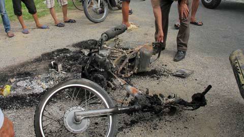 | Hiện trường người dân đốt chiếc xe máy của 2 tên trộm chó chiều 17/7. |