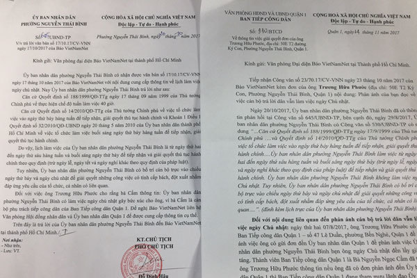 “Ngày 29/7 tôi có gửi đơn khiếu nại đến UBND quận 1,chờ đến ngày 7/8/2017, không thấy mời lên giải quyết. Tôi đến UBND thì được nhân viên tên Cẩm tiếp. Tôi trình bày sự việc xong, chị Cẩm nói tôi về gặp Chủ tịch phường, tôi không đồng ý. Chị Cẩm nói với tôi là ngày Chủ nhật phường vẫn có người làm việc, tôi hỏi 2,3 lần chị vẫn bảo lưu Chủ nhật có người làm việc, lúc đó có một chú ngồi gần đó nói là trả lời sai rồi, xong chị Cẩm bỏ ra ngoài”, trong đơn ông Phước trình bày.