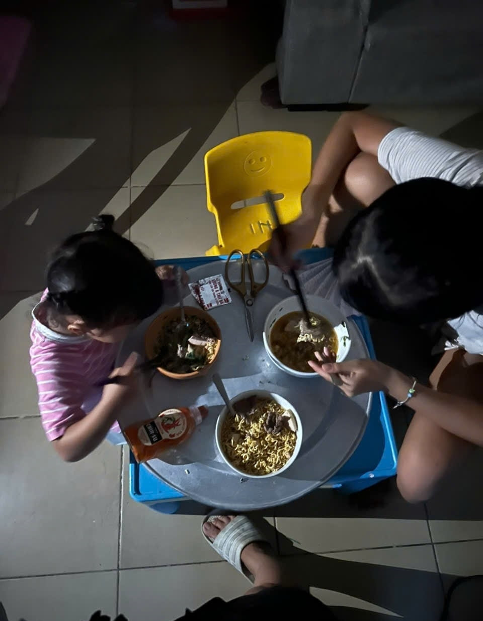Buổi tối, cả nhà thắp nến, ăn tạm cháo, bánh mì kẹp giò chả. Chị Hồng chỉ dám rửa mặt, rửa tay chân cho con, không dám tắm vì sợ hết nước. “Ở đây đã 7 năm nhưng chưa bao giờ tôi chứng kiến cảnh ngập sâu, nước tràn cả vào sảnh, mất điện, mất nước kéo dài như thế này”, chị nói.
