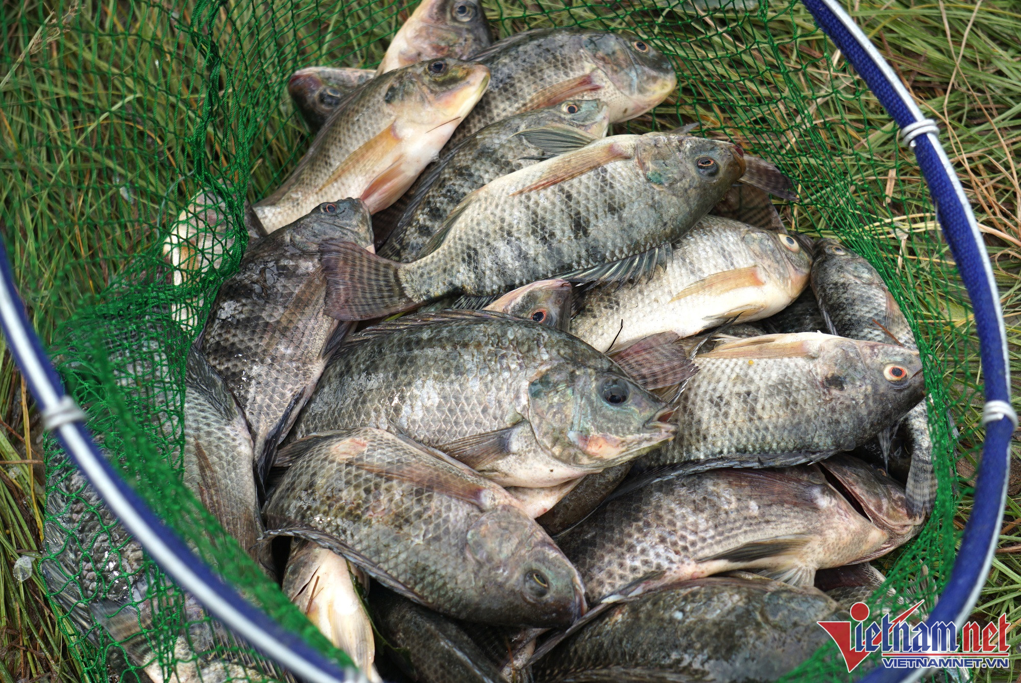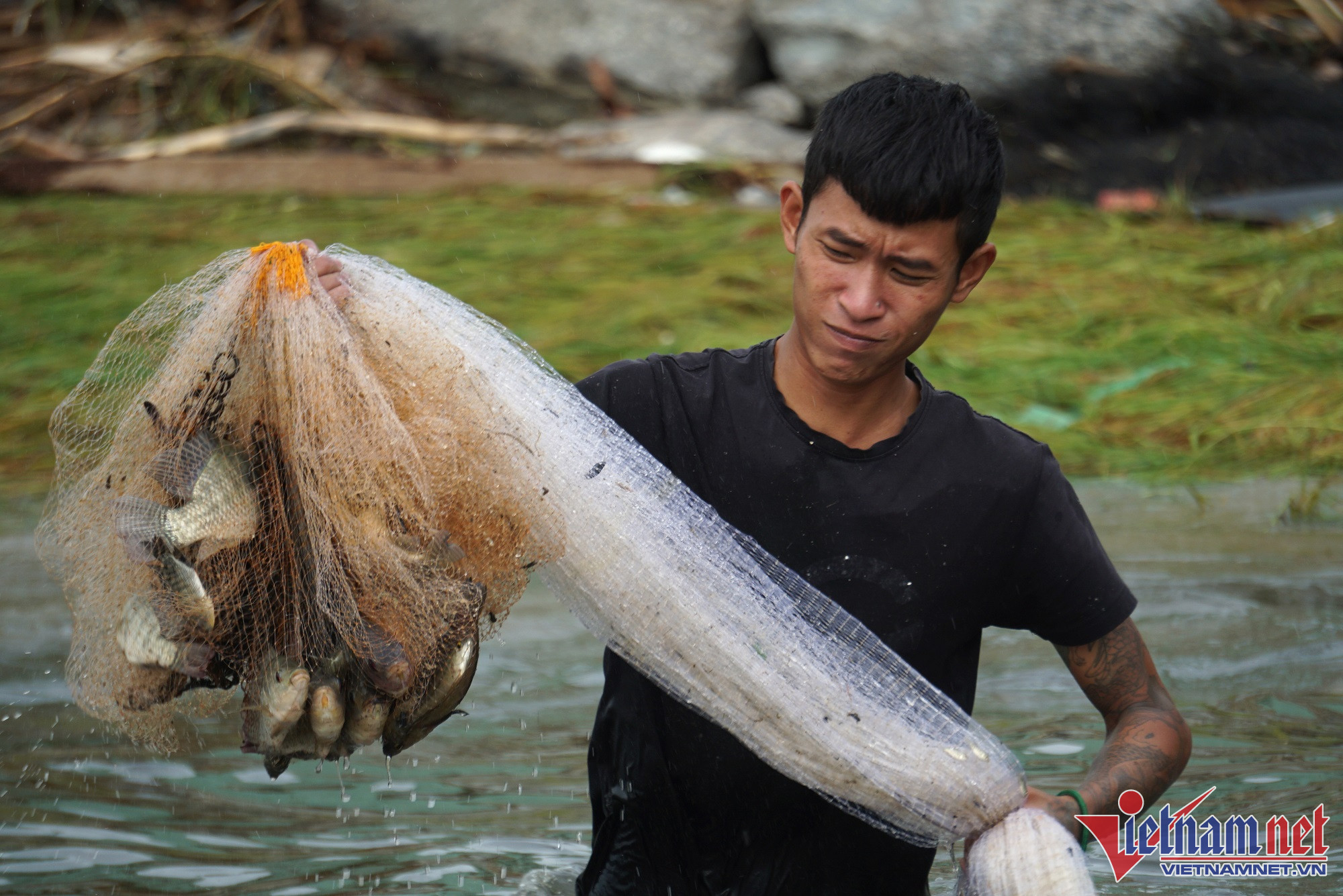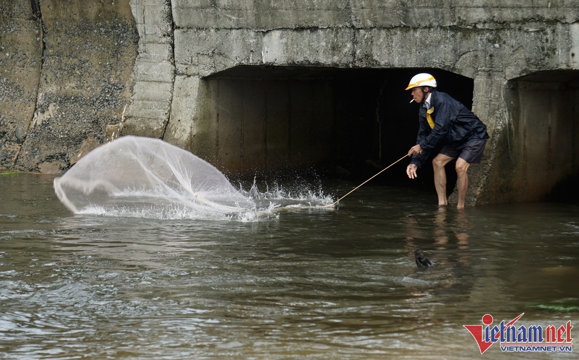 Không chỉ quăng chài, nhiều người còn dùng lưới quây sát bờ biển để bắt cá. Cá bắt được là cá trê, cá diếc, rô phi...Theo người dân địa phương, nếu không bắt, cá gặp nước mặn cũng sẽ chết.Để bắt được cá to, có người đội đèn pin vợt cá phía trong cống nướcSau một tiếng cùng hai người bạn vào phía trong cống dùng vợt bắt cá, nhóm anh Nhân bắt được gần 20kg cá trê. Trong hình là con cá trê to nhất khoảng 5kg mà anh Nhân bắt được.Số cá này được phân loại, bán ngay tại chỗ cho người dân