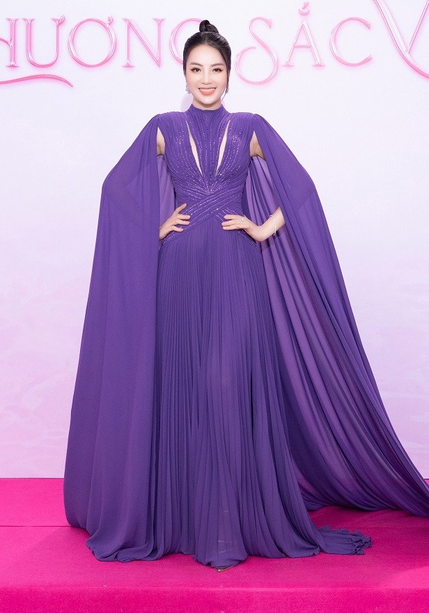 Á hậu Thụy Vân xuất hiện trên thảm đỏ với chiếc váy màu tím. Sau 14 năm đăng quang, cô vẫn giữ được vẻ đẹp trẻ trung, quyến rũ cùng với vóc dáng thon gọn. Năm nay, cô xuất hiện tại Hoa hậu Việt Nam 2022 với tư cách là thành viên BGK.
