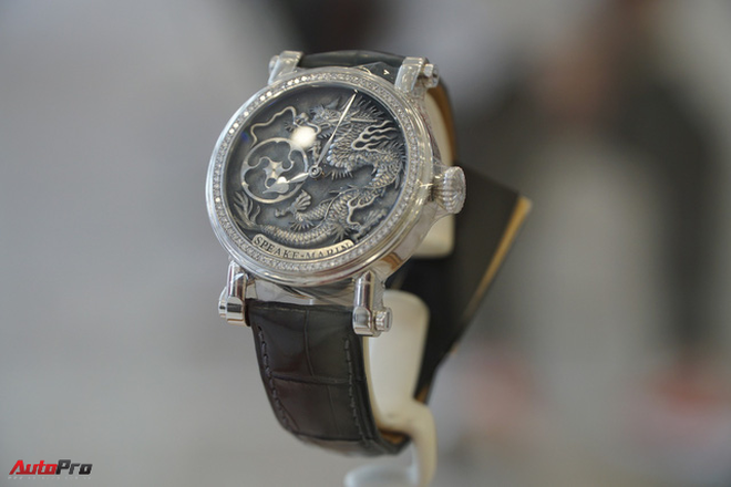Ngoài siêu xe và xe siêu sang, gian hàng còn có những tủ trưng bày với phụ kiện như vali, mô hình xe, cốc và đồng hồ... Một số món đồ khác như vô-lăng hay vành, lốp cũng có nơi bài trí riêng.