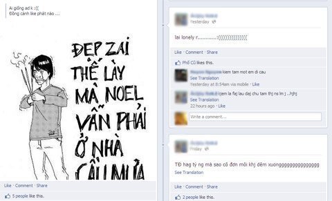 "Đêm Noel này tớ vẫn cô đơn. Nhưng dù sao vẫn chúc các bạn có một đêm Giáng sinh ấm áp và hạnh phúc bên nhau", một Facebooker viết trên tường.