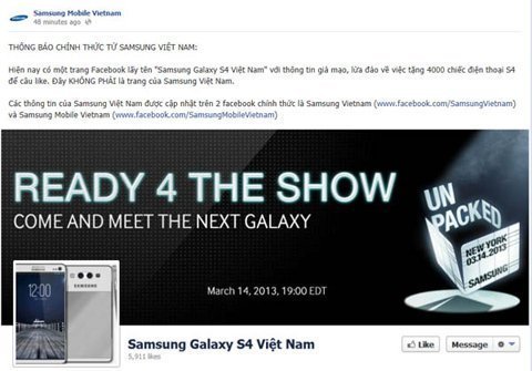 | Ảnh chụp màn hình fanpage Samsung Galaxy S4 Việt Nam lúc 11h00 ngày 13/3. |